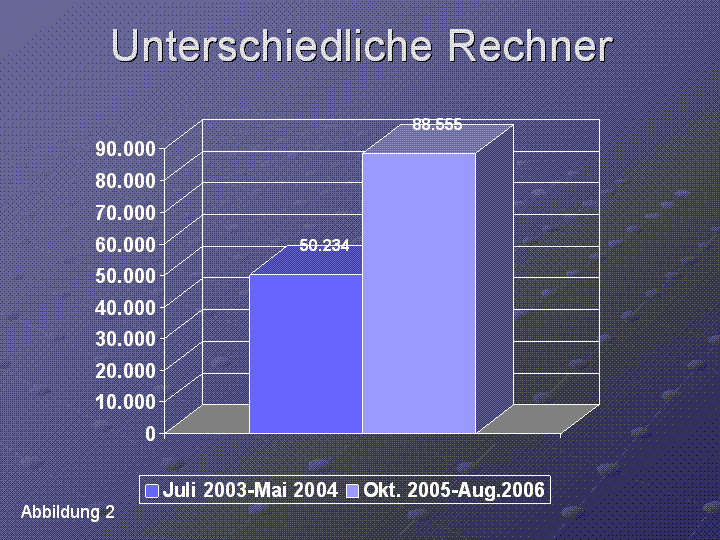 Zwischen Oktober 2005 und August 2006 wurden Zugriffe von 88.555 unterschiedlichen Rechnern (IP-Adressen) registriert, was eine Steigerung von 76% gegenüber dem Vergleichszeitraum Juli 2003 bis Mai 2004 bedeutet. Folglich wurde die AGMB-Webseite von jeder IP- Adresse durchschnittlich siebenmal besucht, der gleiche Wert ergab sich schon in der früheren Untersuchung (Abbildung 2 [Abb. 2]).