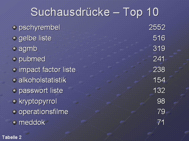 Die Liste der 10 am häufigsten benutzten Suchbegriffe, die in Suchmaschinen wie Google, Yahoo etc. eingegeben worden sind und die zu Treffern auf der AGMB-Webseite geführt haben, wird von „Pschyrembel“ mit 2552 Zugriffen angeführt, gefolgt von „Gelbe Liste“ mit 516 Zugriffen, „AGMB“ mit 319 Zugriffen, „PubMed“ mit 241 Zugriffen und „Impact Factor Liste“ mit 238 Zugriffen (Tabelle 2 [Tab. 2]).