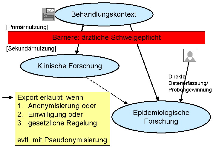 Daten von Patienten oder Probanden werden oft gezielt für ein Forschungsprojekt erhoben, kommen in der Regel aber aus einem Behandlungszusammenhang, wo sie durch die besonders hohe Hürde der ärztlichen Schweigepflicht geschützt sind, wie in Abbildung 2 [Abb. 2] illustriert. Mit einer Einwilligungserklärung kann man zwar viel Freiraum für die Nutzung der Daten erreichen; eine Einwilligungserklärung ist aber unwirksam, wenn sie zu Eingriffen in die Persönlichkeitsrechte führt, die sich durch andere Maßnahmen, wie z. B. Anonymisierung oder Pseudonymisierung, vermeiden ließen, oder wenn ihre Tragweite nicht völlig klar ist, wie es zum Beispiel bei einer Einwilligung zur völlig freien Verwendung von Daten oder zur beliebigen Weitergabe von Proben der Fall wäre.