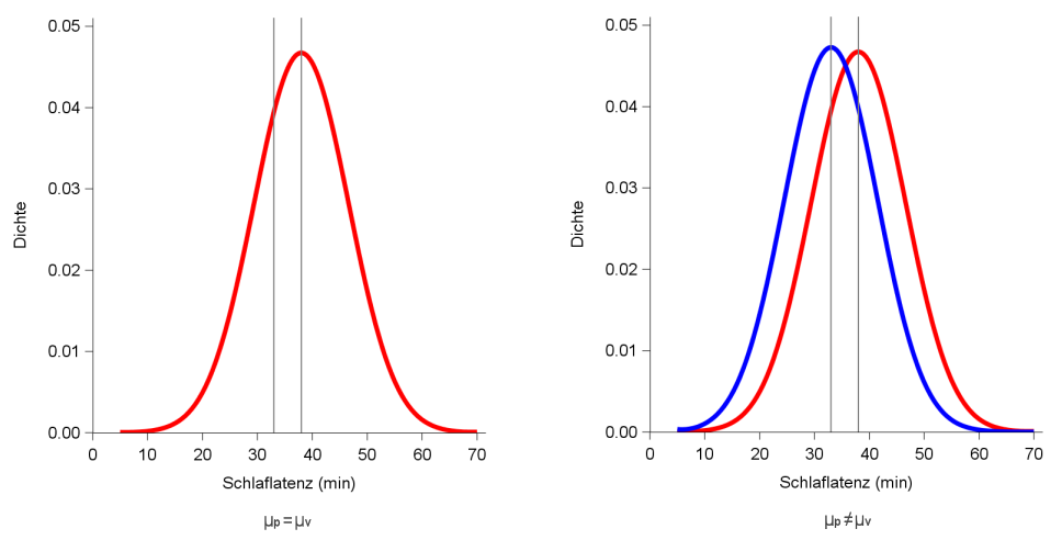 Die Frage, die sich hier stellt, ist, ob die Differenz von 5 min nur Ausdruck eines zufälligen Fehlers ist oder ob diese Differenz Ausdruck einer tatsächlichen Wirkung des Schlafmittels ist. Im ersten Fall würden beide Stichproben aus identischen Populationen stammen (µp=µv), im zweiten Fall würden die beiden Stichproben aus unterschiedlichen Populationen stammen, d.h. aus Populationen mit µp≠µv. Abbildung 1 [Abb. 1] veranschaulicht das Problem: Könnte es sein, dass sich Placebo und Verum in Bezug auf die wahren Schlaflatenz-Durchschnitte nicht unterscheiden, d.h. aus der gleichen Population mit z.B. µ=38 min stammen, und die beiden Stichproben-Durchschnitte (33 min und 38 min) lediglich ein Ausdruck des Stichprobenfehlers sind, ähnlich wie beim Münzwurf einer ungezinkten Münze? Oder könnte es sein, dass das neue Schlafmittel tatsächlich einen Einfluss auf die Schlaflatenz hat, so dass die wahren Mittelwerte aus Zielpopulationen mit unterschiedlichen Mittelwerten stammen (µp≠µv)?