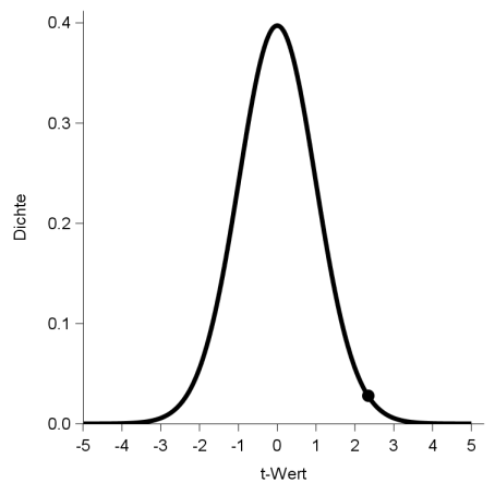 Ein einziger Dichtewert der PDF hat keine praktische Bedeutung. Die Gesamtfläche unter der Kurve der PDF ist 1, so dass (Teil-)Flächen unter der Wahrscheinlichkeitsdichtefunktion die Interpretation von Wahrscheinlichkeiten haben. Im Rahmen der Studie ist es nun möglich, die Frage zu beantworten, wie hoch die Wahrscheinlichkeit ist, dass der t-Wert ≥+2,33 unter der Nullhypothese (µp=µv) annimmt, d.h. t=0.