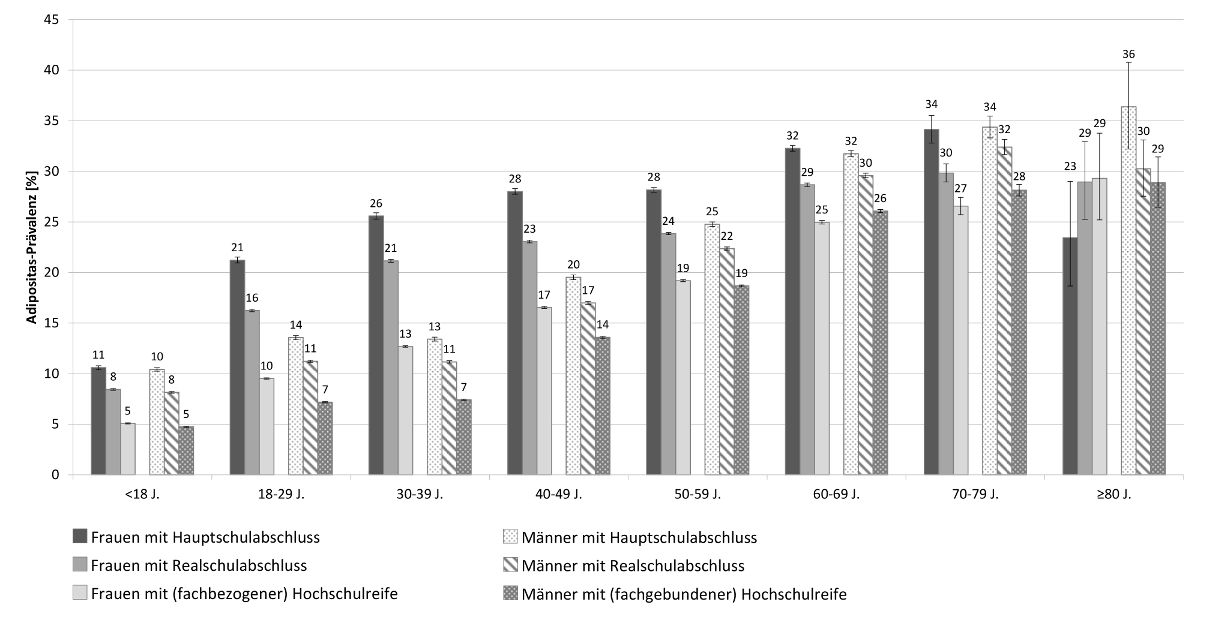 Ergänzend zu den Auswertungen basierend auf GePaRD wurden die im Rahmen der GEDA-2014/2015-Befragung des RKI erhobenen Primärdaten vergleichend ausgewertet [15], d.h. es wurde auch die Adipositas-Prävalenz nach Alter, Geschlecht und Schulbildung (in den Kategorien (Fach-)Abitur, mittlere Reife und Hauptschulabschluss) ermittelt. An der Befragung, die mittels elektronischer Fragebögen oder Telefoninterviews durchgeführt wurde, nahmen 24.016 Personen ab 18 Jahren mit Hauptwohnsitz in Deutschland teil [16].
