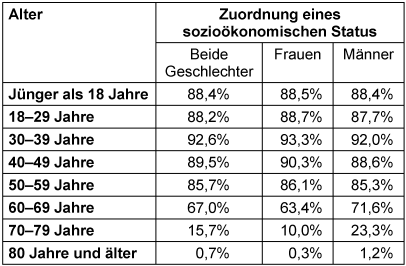 Tabelle 2: Anteil der Versicherten, denen ein sozioökonomischer Status zugeordnet werden konnte, nach Alter und Geschlecht (dabei wird der Code „kein Schulabschluss“ als gültiger Code klassifiziert und ist entsprechend in den berechneten Anteilen enthalten)