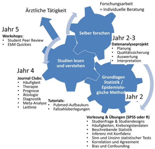 Bei der Vermittlung einer wissenschaftlichen Qualifikation einschließlich EbM und der Befähigung zu verantwortungsvoller eigener Forschung kommt daher den Datenwissenschaften Epidemiologie, Biometrie und Medizininformatik als Grundlagenfächern klinischer Studienmethodik eine besondere Bedeutung zu. Wir möchten mit der vorliegenden Projektvorstellung zu einem Austausch über Umsetzungsmöglichkeiten beitragen.