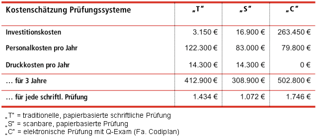 Tabelle 2: Kostenschätzung für ausgewählte Systeme für schriftliche Prüfungen. Personalkosten basierend auf Stundenbasis von 1 Wissenschaftl. Mitarbeiter (E-Besoldung), 2 Aufsichtskräften, 1 HiWi für Auswertung