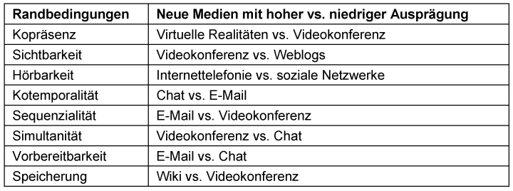 Die Kopräsenz neuer Medien kann sehr verschieden sein. So hat man in virtuellen Welten das Gefühl räumlich mit dem Kommunikationspartner verbunden zu sein. In einer Videokonferenz dagegen, drängt sich dieses Gefühl nicht unbedingt auf. Die gegenseitige Sichtbarkeit ist bei Weblogs beispielsweise nicht gegeben, was dazu führen kann, das eine mehr enthemmte Kommunikation stattfindet als in Videokonferenzen. Gegenseitige Hörbarkeit kann zwar zu einem schnellen Informationsaustausch führen, aber kognitiv sich dadurch nachteilig auswirken, dass gesprochenes weniger elaboriert und reflektiert wird als geschriebenes. Hohe Kotemporalität entsteht, wenn synchron kommuniziert wird. Demgegenüber besteht die Gefahr bei asynchroner Kommunikation beispielsweise durch E-Mails darin, dass der Inhalt durch die Verzögerung nicht mehr auf dem aktuellsten Stand ist. Eine normale Gesprächssituation zeichnet sich dadurch aus, dass die Gesprächsteilnehmer sich in ihren Beiträgen abwechseln. Diese Sequenzialität stellt sicher, dass sich die Beiträge aufeinander beziehen und ergänzen; besonders gut lässt sich das beispielsweise mit der Antwort-Funktion bei E-Mails oder in Diskussionsforen realisieren. Um nonverbale oder paraverbale Informationen gewinnbringend artikulieren zu können, benötigt es ein Softwaresystem, das Simultanität zulässt. Das ist vor allem in Videokonferenzsystemen der Fall. Ein Kriterium, das sich in der Face-To-Face-Kommunikation nicht realisieren lässt, ist die Vorbereitbarkeit. Asynchrone Medien erlauben es, sich über das, was mitgeteilt werden soll vorher tiefer gehende Gedanken zu machen. Die kommunizierte Information ist damit zumeist durchdachter als in einem Gespräch. Auch die Speicherung der Inhalte während oder nach der Kommunikation ist primär durch neue Medien realisierbar. So lassen sich E-Mails oder wissenschaftliche Arbeiten in Wikis dauerhaft speichern und abrufen.