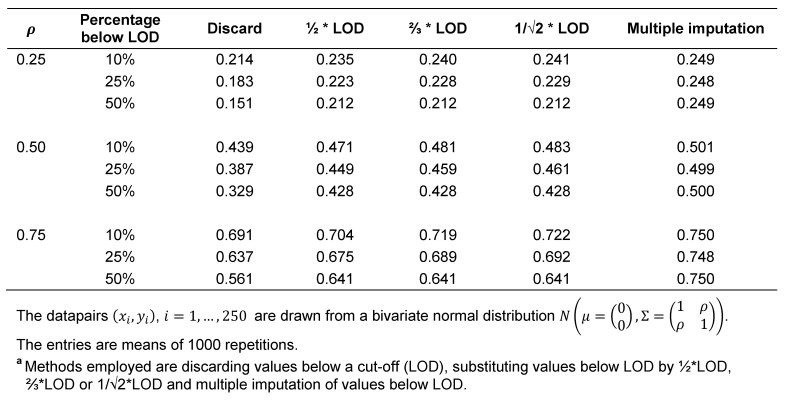 Table 2: Results of a simulation study comparing different methodsa to estimate the correlation coefficient in the presence of a left-censored variable y