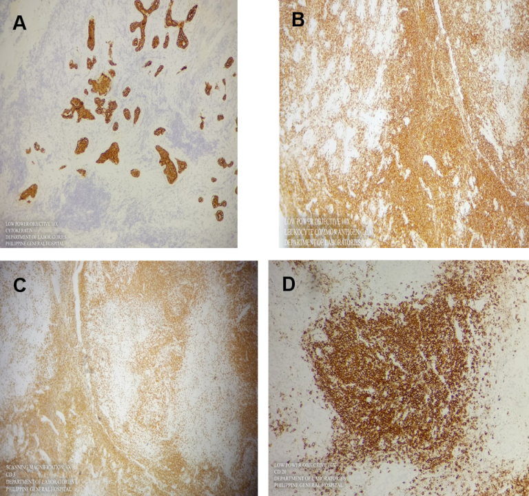 Four histochemical stains were requested for the patient. The first two will differentiate between epithelial and lymphoid tissue origin. If the specimen stain positive for lymphoid origin, it will then be stained to differentiate between T cell lineage and B cell lineage (Figure 6A [Fig. 6]).