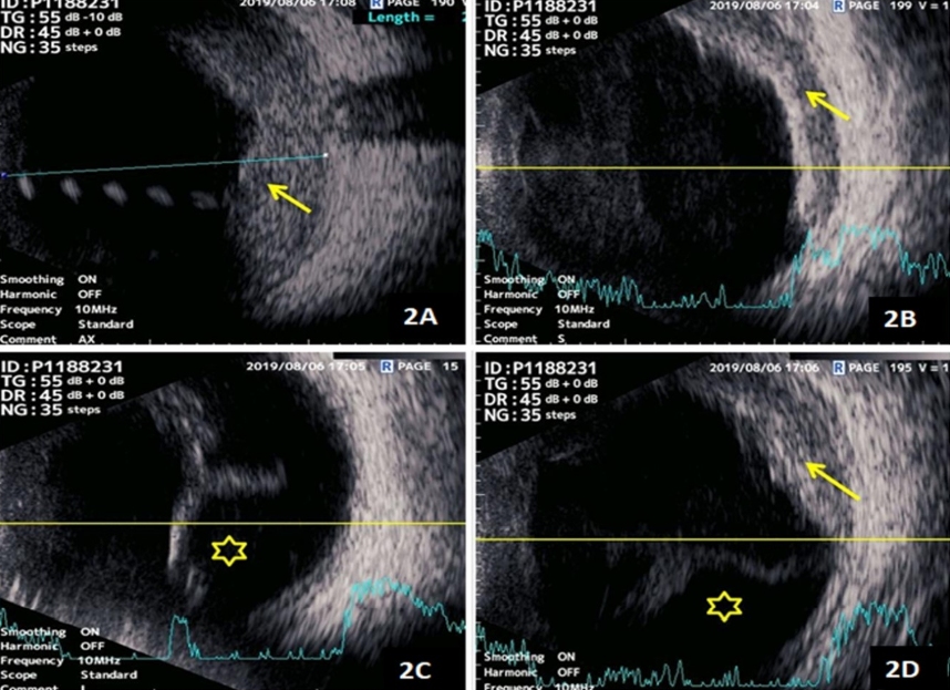 Figure 2: A) Right-eye ultrasound B-scan in the axial scan showed an elevated mass lesion in the choroid with moderate to high internal echogenicity (yellow arrow). B–D) The transverse and dynamic ultrasound B-scans also showed presence of exudative retinal detachment in the inferior and nasal scans (yellow asterisk in 2C and 2D) with elevated moderate to high echogenic choroidal lesions in the superior and nasal scans (yellow arrow in 2B and 2D).