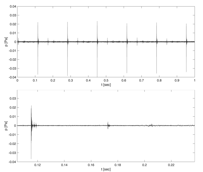 Abbildung 5: Verlauf des Schalldrucks über die Zeit bei der Messung mit CI-Explantat Mi1200. Oben: Sechs aufeinander folgende Anregungen durch den Shaker. Unten: Eine einzelne Anregung durch den Shaker.