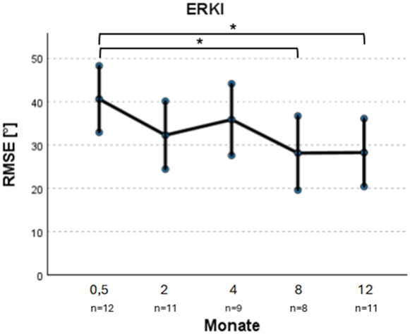 Abbildung 1: Wurzel des mittleren quadratischen Fehlers (RMSE) der Schallquellenlokalisierung über die Monate. Gemessen mit dem „Erfassen des Richtungshörens bei Kindern (ERKI)“ System