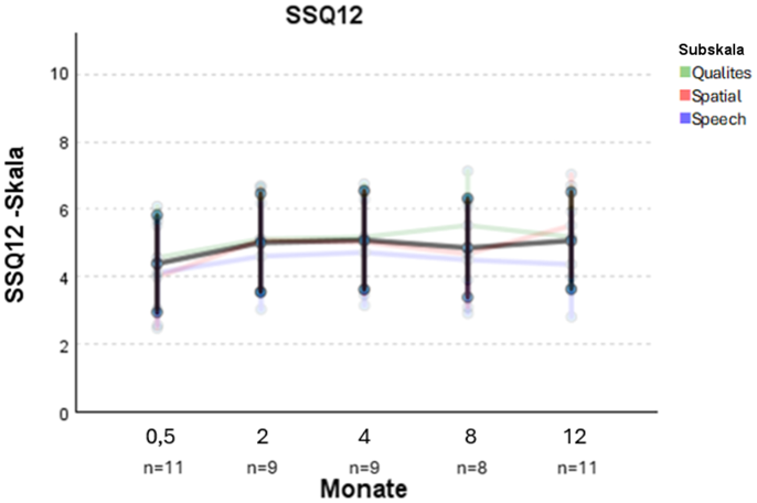 Abbildung 3: Ergebnisse des „Speech Spatial Qualities Questionnaire“ (SSQ12) über die Monate