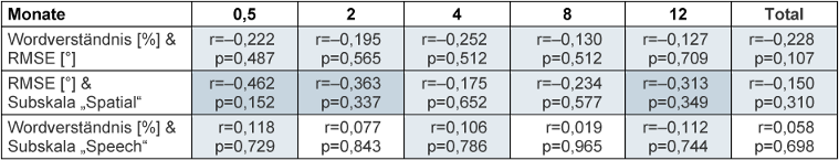 Im Vergleich zur Erhebung zwei Wochen nach der Erstanpassung zeigte sich beim Richtungshören eine signifikante Reduktion des Root Mean Square Error (RMSE) nach acht Monaten (t(36)=–3,114, p=0,033) sowie nach zwölf Monaten (t(35)=–3,432, p=0.016) (Abbildung 1 [Abb. 1]). Das Einsilberverstehen verbesserte sich signifikant nach vier Monaten (t(36)=3,334, p=0,018) und nach zwölf Monaten (t(36)=3,596, p=0,010) (Abbildung 2 [Abb. 2]). Die SSQ12-Gesamtwerte zeigten nach zwölf Monaten hingegen keine signifikanten Veränderungen (t(32)=2,143, p=0,398), ebenso wenig wie die Subskalen „Speech“ (t(32)=0,684, p=1,000) und „Qualities“ (t(32)=1,057, p=1,000). Für die Subskala „Spatial“ ergab sich ein Wert nahe der statistischen Signifikanz (t(32)=2,974, p=0,055) (Abbildung 3 [Abb. 3]). Ein signifikanter Zusammenhang zwischen Richtungshörvermögen, Sprachverständnis und subjektiver Wahrnehmung konnte bislang nicht festgestellt werden (Tabelle 1 [Tab. 1]).