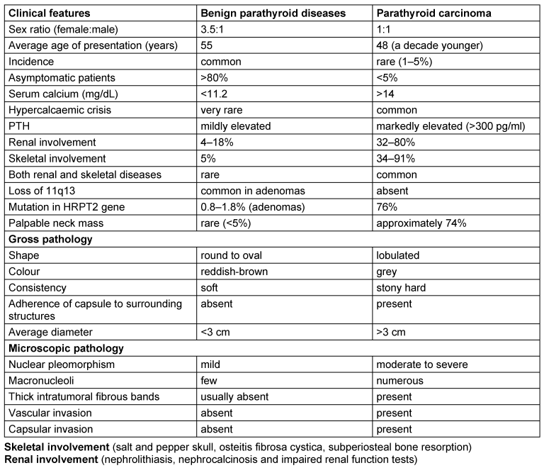 Table 1: Clinical and pathological differences between a benign parathyroid disease and a parathyroid carcinoma