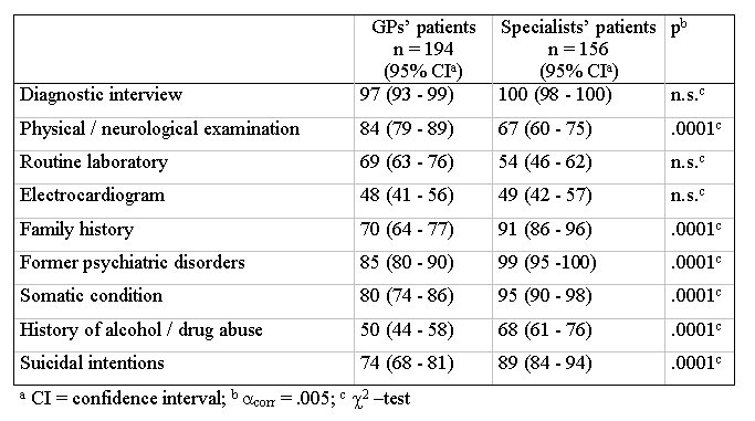 Nearly all physicians completed an assessment interview [Tab. 2] and 84% of GPs versus 67% of specialists had performed a physical/neurological examination (χ2 = 12.86, df = 1, p < 0.0001). Other diagnostic themes such as family history (70% of GPs vs. 91% of specialists; χ2 = 22.45, df = 1, p < 0.0001), former psychiatric disorder (85% of GPs vs. 99% of specialists; χ2 = 18.74, df = 1, p < 0.0001) and somatic condition (79% of GPs vs. 95% of specialists; χ2 = 17.27, df = 1, p < 0.0001) were more frequently investigated by the specialists. Only 50% of the GPs and 68% of the specialists had addressed the topic of comorbidity with alcohol or drug abuse (χ2 = 11.84, df = 1, p < 0.0001). Concerning suicidal intentions, distinct differences emerged: only 74% of the GPs vs. 89% of the specialists had explored suicidal intention of their patients (χ2 = 11.89, df = 1, p < 0.0001).
