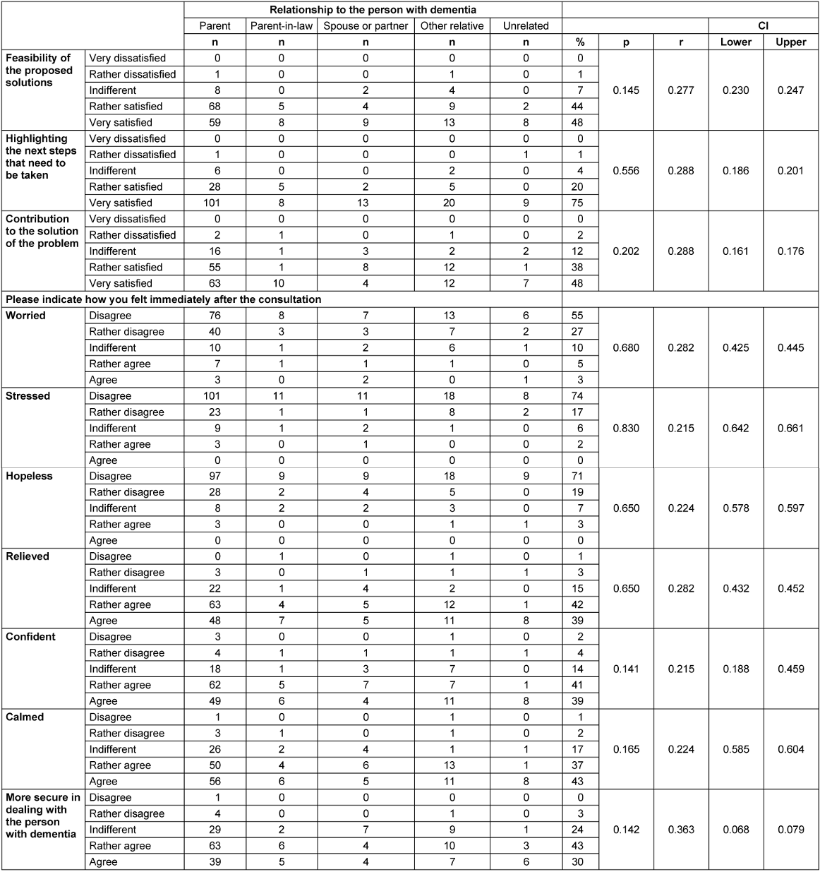 About half of the callers (48%) expressed full confidence that the proposed solutions were feasible for them and would help solve the problem at hand. Most callers also reported feeling relieved after the consultation (Table 7 [Tab. 7]). 30% said they felt more confident in dealing with the person with dementia after the consultation. Negative feelings such as uncertainty, hopelessness or stress were overwhelmingly denied in all groups of callers. Callers felt that the counseling was appropriate and appreciated the counsellor’s balancing act between too personal and too impersonal consultation (Table 8 [Tab. 8]).