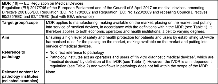 The association of the scientific medical societies in Germany (Arbeitsgemeinschaft der Wissenschaftlichen Medizinischen Fachgesellschaften e.V. (AWMF)) regularly publishes statements on (planned) changes to medical device law. Thus, the association presents and comments on the requirements that health institutions must fulfil for the in-house manufacture of IH-IVDs due to the IVDR and points out definitional gaps in the regulation [1]. The AWMF also commented on the current draft bill of the German Federal Ministry of Health (Bundesgesundheitsministeriums) for the planned amendment of the German Ordinance on Operators of Medical Devices (MPBetreibV) [3]. This draft provides for an expansion of its scope of application, which is due to increasing digitalisation. It is now also intended to regulate the handling of medical device software. This is in line with the new inclusion of “software” in the definitions of “medical device” and “in vitro diagnostic medical device” in the MDR and IVDR (Table 1 [Tab. 1]). In the previous medical device directive (MDD) and in vitro diagnostic medical device directive (IVDD) software was not yet part of the definitions. Furthermore, it is planned to delete § 4, section 1 of the ordinance MPBetreibV. This section currently permits the use of medical devices and IVDs only in accordance with their intended purpose as specified by the manufacturer, whereas the IVDR also permits the use outside of the intended purpose and thus enables health institutions to address the specific needs of target patient groups (Article 5 (5)). The planned repeal of this section of the MPBetreibV thus underlines the freedom of method choice of pathologists and represents harmonisation with the IVDR.