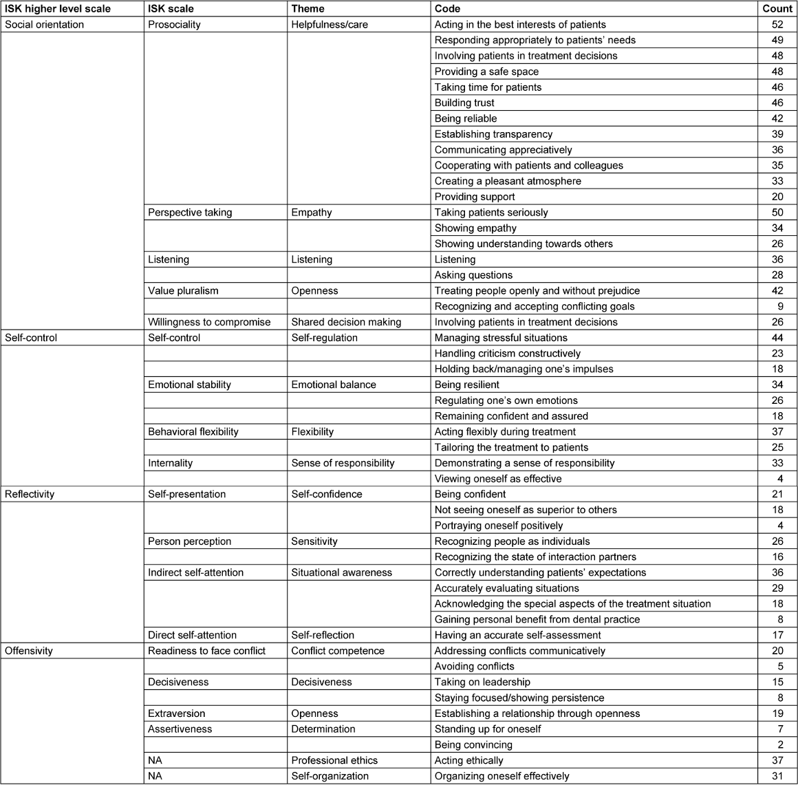 Overall, 49 codes emerged from the interviews, which were assigned to the 17 themes within Kanning’s framework [33] (see Table 1 [Tab. 1]). Although “social skills” were not explicitly defined in the interviews, aspects from all 17 Inventory of Social Competences (Inventar Sozialer Kompetenzen, ISK) scales were coded, with the theme “helpfulness/care”, linked to the “prosociality” ISK scale, being the most elaborated.