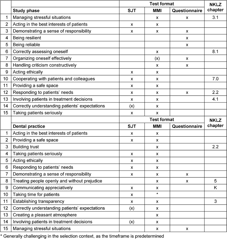The 15 most important skills and behaviors for both study and professional practice were examined to evaluate their suitability for selection procedures prior to starting studies or for competency assessment after graduation, as well as to identify appropriate methods for measurement. The SJT items used in the 2020 human medicine selection process were initially mapped to social skills and then assessed for their suitability in dental student selection.