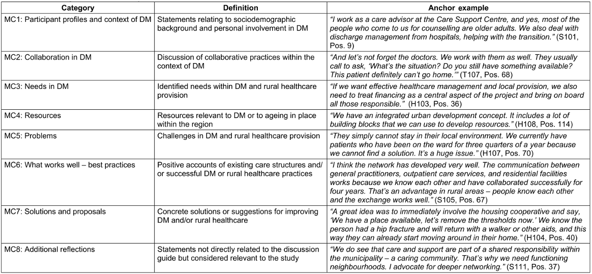 The study was conducted in accordance with the quality criteria for qualitative research by Steinke [20], [21]. To ensure transparency and reproducibility, all steps of data analysis were documented using MAXQDA software. The coding was conducted by two researchers using a standardised procedure and a combination of deductive and inductive reasoning. Empirical grounding [21] was ensured through the coding structure, the link to a prior scoping review (Petereit et al., under review), and the systematic derivation of findings from the data. The study demonstrates internal coherence and is of practical relevance [21], as it provides insight into the implementation of DM in rural regions.