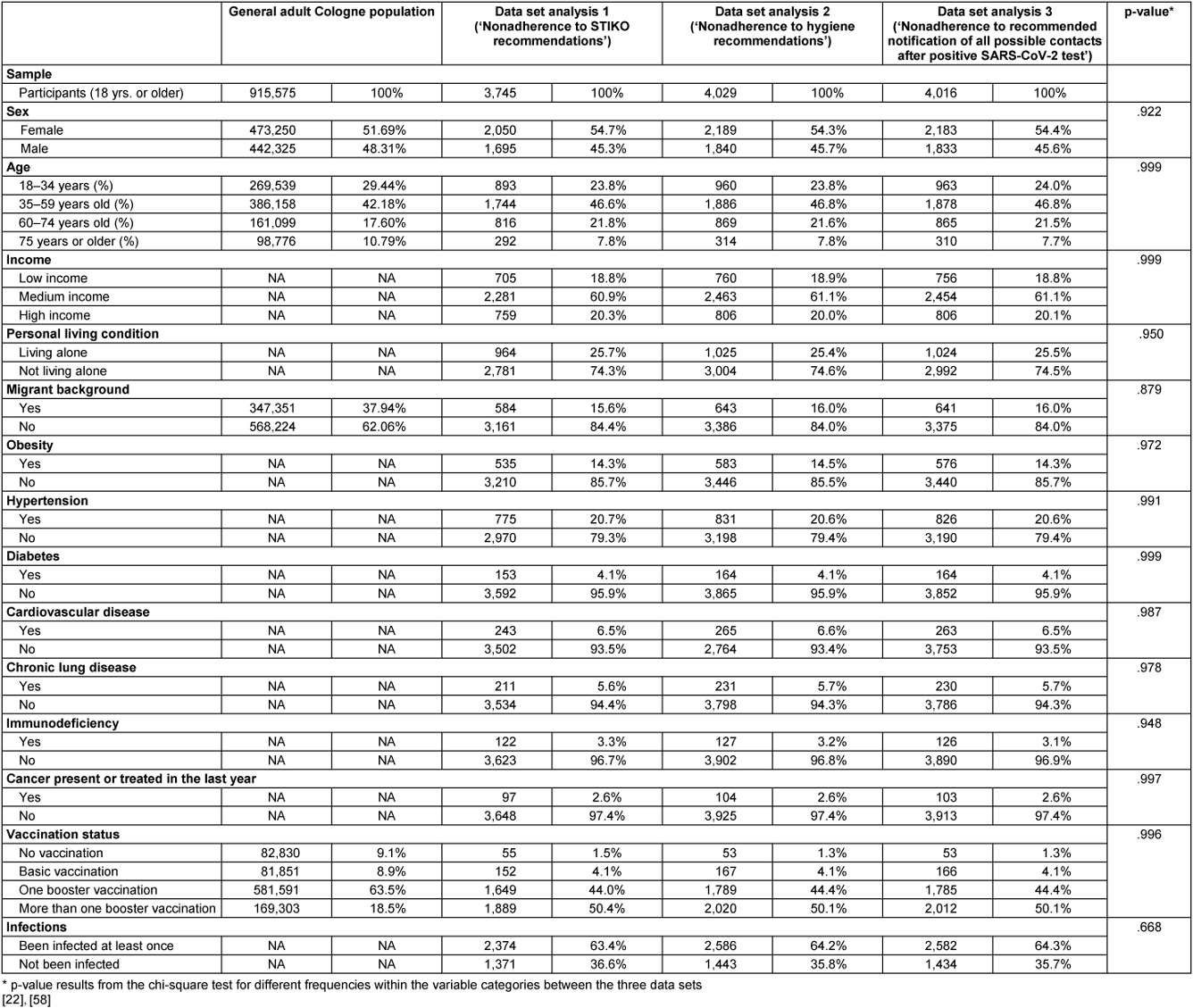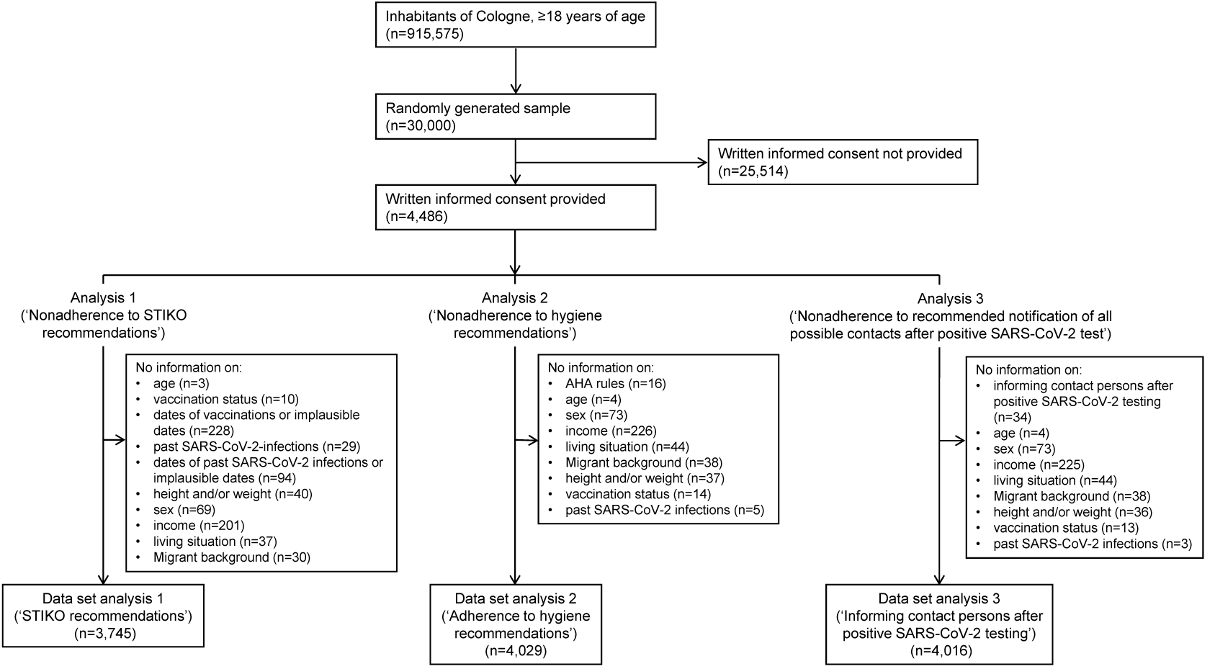 Results: Out of 30,000 invited Cologne residents, 4,486 (15%) responded, with 10% reporting not having received recommended SARS-CoV-2 vaccination. Nonadherence correlated significantly with older age, male gender, low income, living alone, migrant background, and chronic lung disease. 80% reported not adhering to current hygiene recommendations, linked to younger age, absence of certain pre-existing conditions, and prior SARS-CoV-2 infection. Additionally, 16% reported hesitancy in informing all contacts upon testing positive, associated with male gender, absence of certain pre-existing conditions, and fewer booster doses.