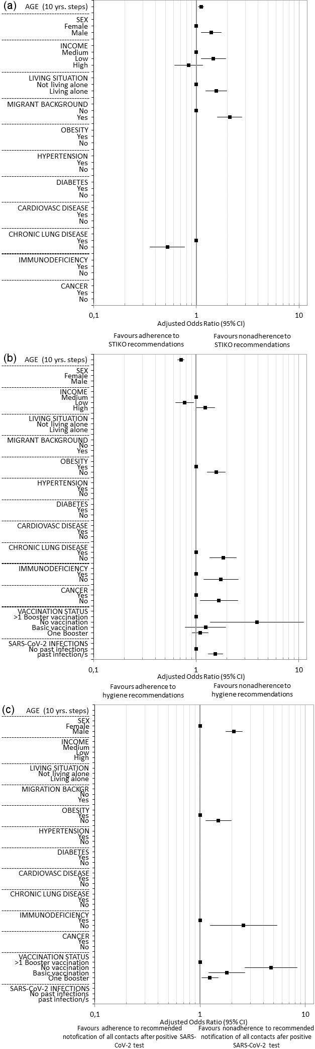 Figure 2: Forest plots of the results of the multivariable (selected model) logistic regressions – (a) associations with nonadherence to STIKO recommendations, (b) associations with nonadherence to hygiene recommendations – (c) associations with nonadherence to recommended notification of all possible contacts after positive SARS-CoV-2 test