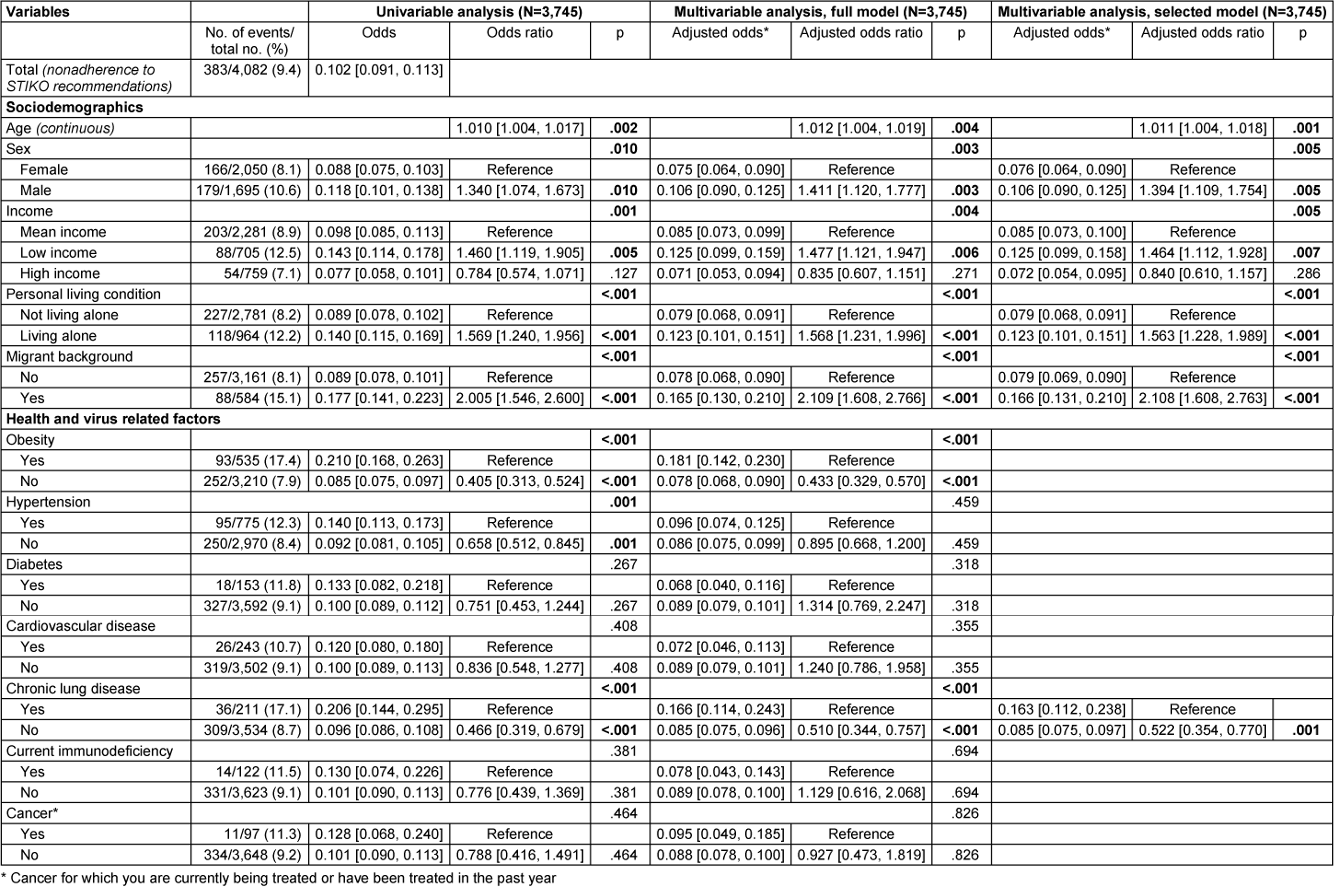 Table 2: Results of univariable and multivariable (full and selected model) binary logistic regression on nonadherence to STIKO recommendations