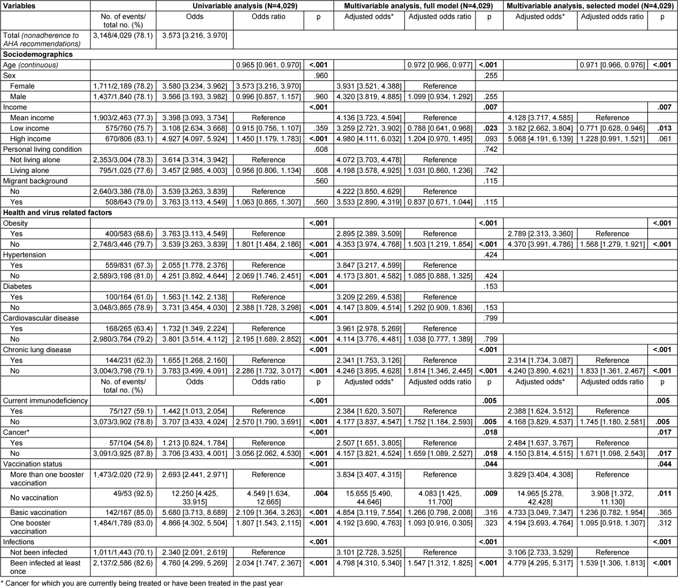 Outcome variables included nonadherence to STIKO recommendations, nonadherence to hygiene rules (AHA rules), and nonadherence to notifying all contacts after a positive SARS-CoV-2 test. Logistic regression was used to examine associations between each outcome variable and sociodemographic, health, and virus-related variables. The following sociodemographic variables were included in the analysis: age (continuous), sex, self-reported income, personal living situation, and migrant background. The following health and virus-related variables were included into the analysis: obesity, hypertension, diabetes, cardiovascular disease, chronic lung disease, current immunodeficiency, cancer currently being treated or treated in the last year, vaccination status, and previous infections.