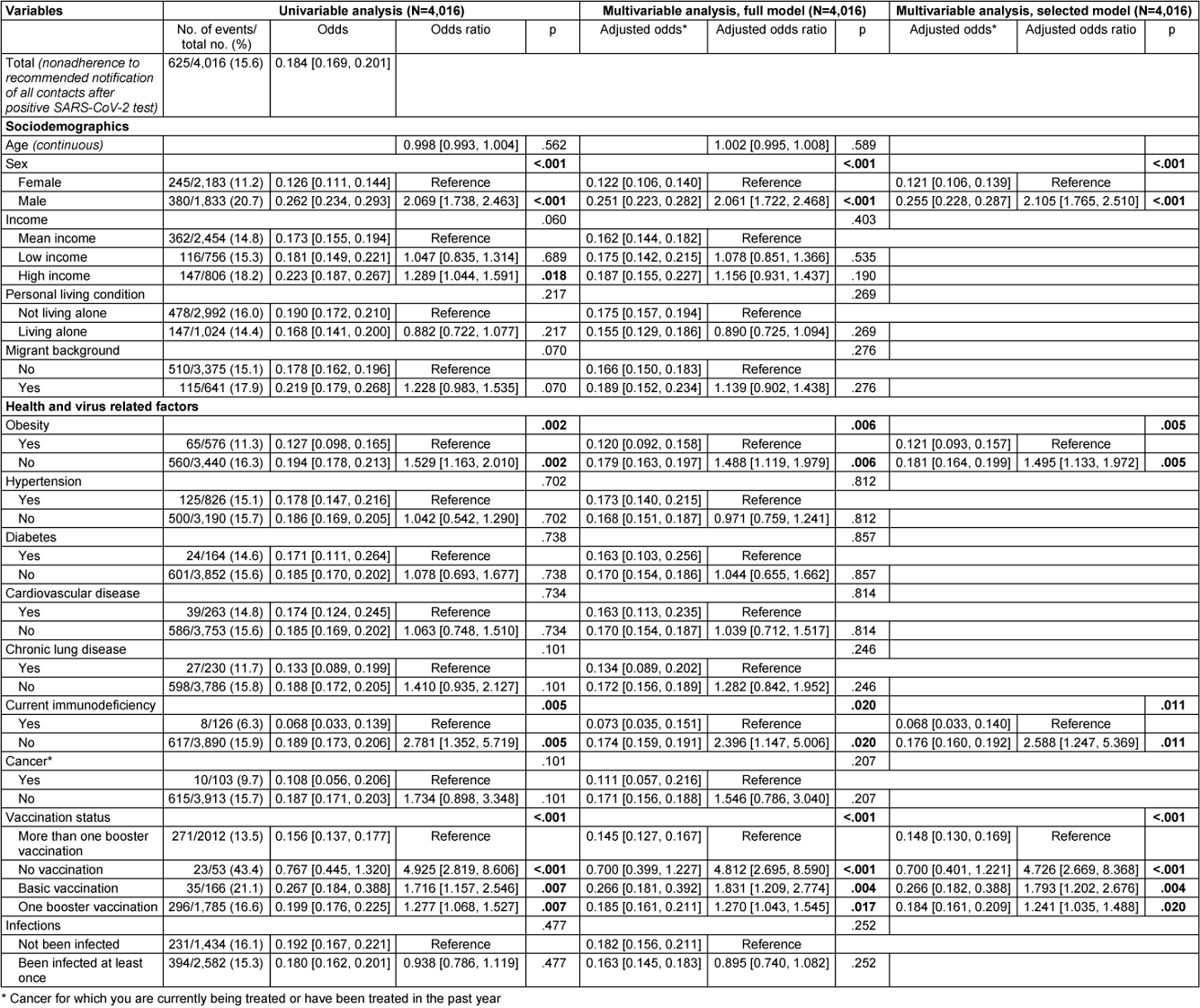 Table 4: Results of univariable and multivariable (full and selected model) binary logistic regression on nonadherence to recommended notification of all contacts after positive SARS-CoV-2 test