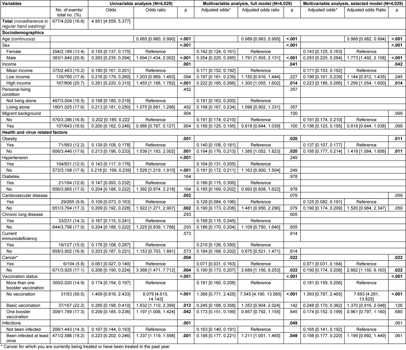 Table 3: Results of univariable and multivariable (full and selected model) binary logistic regression on nonadherence to hygiene recommendations (AHA recommendations)