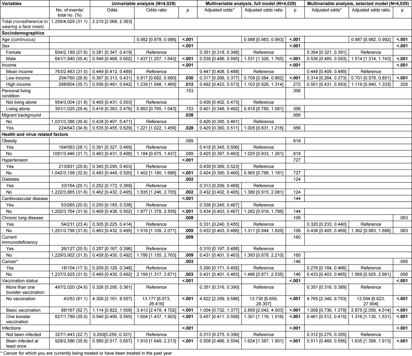 Table 8: Results of univariable and multivariable (full and selected model) binary logistic regression on nonadherence to wearing a face mask