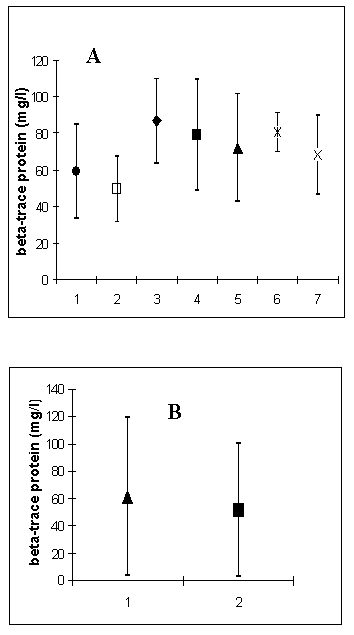 β-TP is completely different to β2-transferrin. With a molecular mass of 23.500 Dalton β-TP is identical to glutathion-independent prostaglandin D synthase [10], which seems to play an important role in regulating the sleep and waking state [11]. So far, the highest concentrations of β-TP were found in CSF and seminal fluid [12]. In serum, the level of β-TP is below the detection limit (< 5 mg/l) of rocket immunoelectrophoresis. Only participants with severe renal filtration barrier pathology would show a detectable concentration of β-TP.