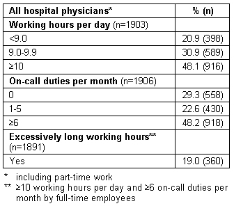 'Working time overload' is a genuine burden for hospital physicians. Only a minority work less than nine hours per working day and have less than six on-call shifts per month. Every fifth hospital physician bears the double burden of consistently long working days (ten hours or more) as well as very frequent on-call shifts (six or more per month), amounting to an average working week of 63 hours or more.