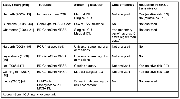 Table 3: Studies evaluating the clinical efficacy (reduction in MRSA transmission) and cost-efficiency of PCR-based MRSA screening