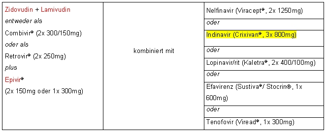 Bei HIV-Exposition wird zuerst eine Dreifachkombination gegeben, z.B. Zidovudin + Lamivudin + Indinavir (Tabelle 3 [Tab. 3]).