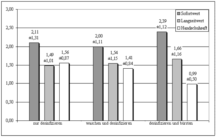 Zusammenfassend ergibt sich, dass die alleinige Desinfektion und die Desinfektion in Verbindung mit Einbürsten des Alkohols der Standardmethode mit vorheriger Seifenwaschung tendentiell überlegen ist. Dabei ist die Wirkung von 60% v/v Propan-1-ol der von 79% v/v Ethanol leicht überlegen, beide übertreffen jedoch 60% v/v Propan-2-ol signifikant an desinfizierender Wirkung.