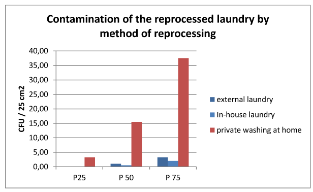 Regarding individual results, it was found that 15 of 18 externally reprocessed gowns exhibited ≤10 cfu/25 cm2, but two of them had ≥150 cfu/25 cm2. In 19 of 20 samples of the in-house prepared laundry, ≤10 cfu/25 cm2 were detected, with a maximum value of 17 cfu/25 cm2. All of the privately prepared clothes were contaminated, 8 of them exhibiting ≤10 cfu/25 cm2 and 12 between 13 and 77 CFU/25 cm2.