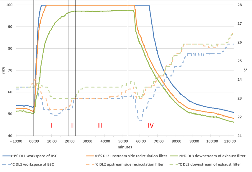 Figure 3: Illustration of the process phases (I: conditioning phase 1; II: conditioning phase 2; III: decontamination phase; IV: ventilation phase) and the measured relative humidity (rH in %) and temperature (T in °C) at three positions of data loggers (DL 1-3) using the example of fogging in the Holten LaminAir Safe 2010 Model 1.5.