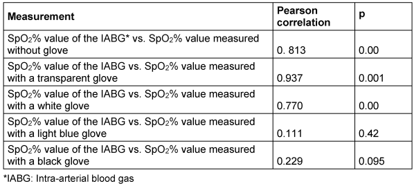 Pearson’s correlation was used to test the relationship between the mean SpO2% value of the IABG measurements and the mean SpO2% values obtained from gloveless fingers or with gloves of different colors. There was a positive significant correlation between the mean SpO2% value of the IABG measurements and the mean SpO2% values obtained from fingers without a glove (r=0.813, p=0.00). There was a positive significant correlation between the mean SpO2% value of the IABG measurements and the mean SpO2% values obtained from fingers with a transparent glove (r=0.937, p=0.001). There was a positive significant correlation between the mean SpO2% value of the IABG measurements and the mean SpO2% values obtained from fingers with a white glove (r=0.770, p=0.00). There was no correlation between the mean SpO2% value of the IABG measurements and the mean SpO2% values obtained from fingers wearing a light blue glove (r=0.111, p=0.42). No correlation was found between the mean SpO2% value of the IABG measurements and the mean SpO2% values obtained from fingers wearing a black glove (r=0.229, p=0.095) (Table 4 [Tab. 4]).