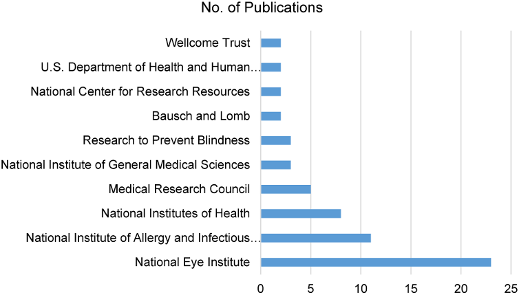 Most of the articles in this bibliometric analysis received funding. The funding bodies that contributed to the maximum number of articles, i.e., the National Eye Institute, National Institute of Allergy and Infectious Diseases, and National Institutes of Health, were all from the US. This robust financial backing has played a pivotal role in the US lead in advancing investigations and translating its findings into clinical practice. Not even a single funding body was found to be based in the endemic developing countries. Although the US and other foreign funding bodies invest in research and xx? development in low-income countries, it is irregular, insufficient, and comes with strict requirements. The result of this is that despite lower labor costs, researchers in the developing world face a double funding crisis: lower absolute levels of funding than in the West and greater research expenditures [27]. As a result, it emphasizes how crucial it is to create a comprehensive local-health finance strategy for these nations, designating at least 15% of the national budget for health development [28], [29].