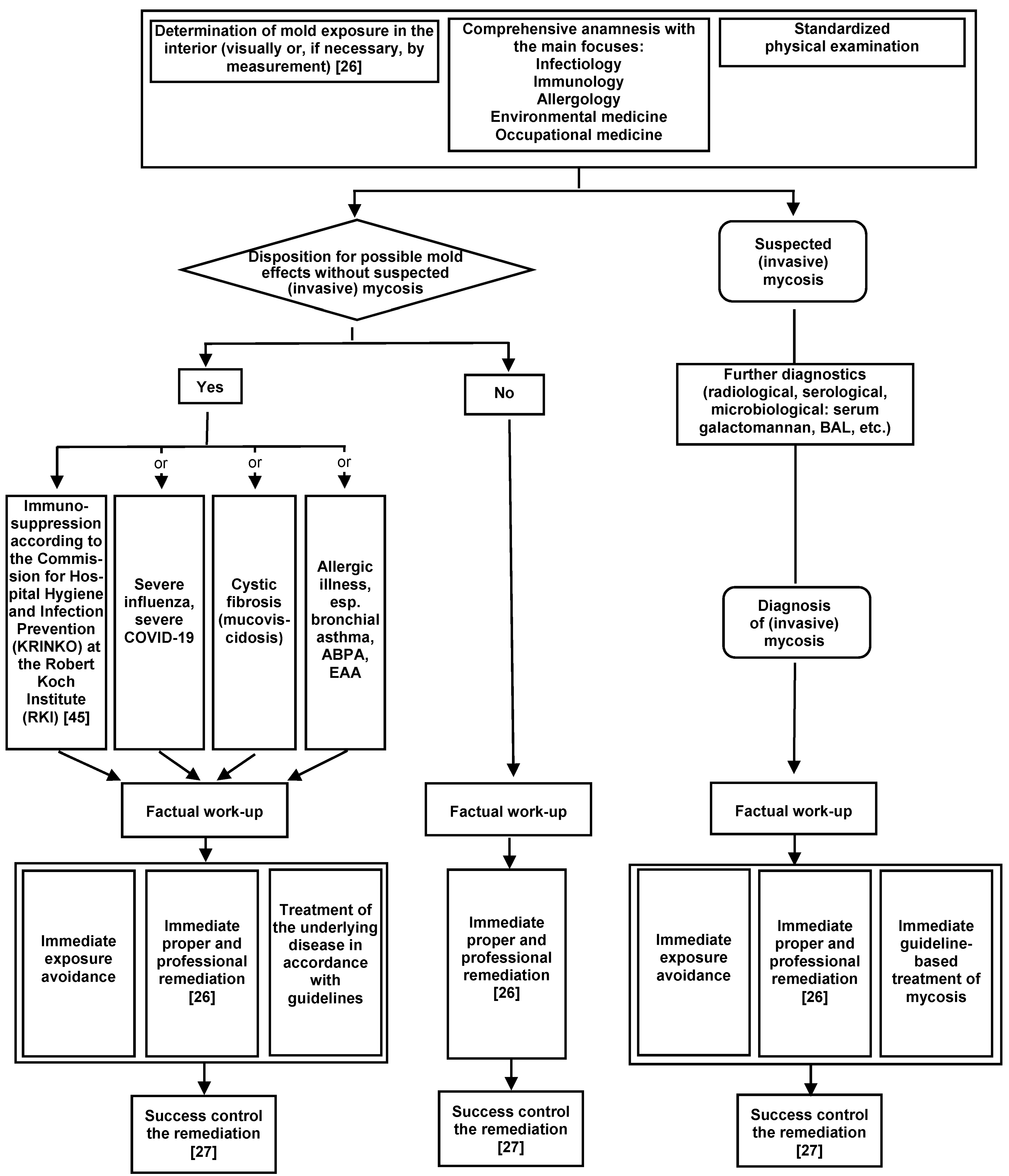 As a matter of principle with all chronic illnesses, it must be ensured that the living conditions are hygienically impeccable, even without evidence or with insufficient proof of a connection to moisture damage and/or mold exposure. If there are hygienic indications or anamnestic evidence of moisture damage and/or mold exposure, the primary causes must always be eliminated, as with all moisture damage.