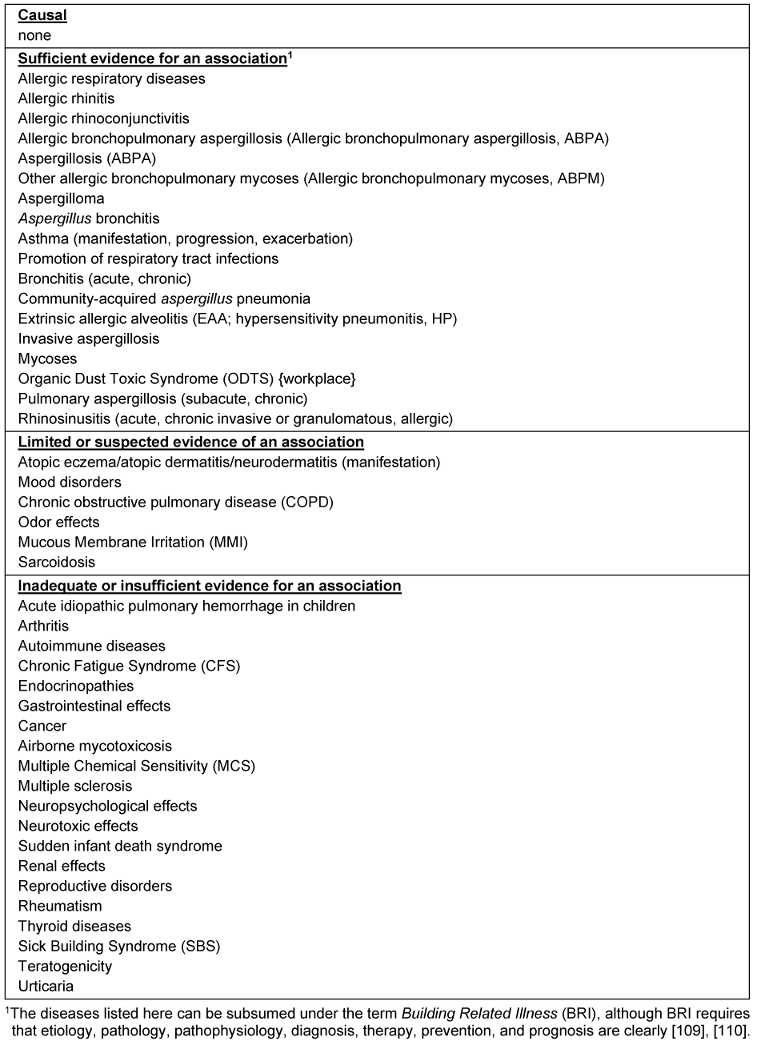 Table 1: Evidence for the relationship between indoor damp/mold exposure and disease (in alphabetical order) [1], [2].