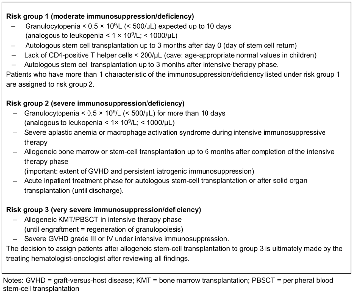 According to the recommendation of the Commission for Hospital Hygiene and Infection Prevention (KRINKO) at the Robert Koch Institute [45], immunosuppressed persons can be divided into three risk groups (Table 2 [Tab. 2]):