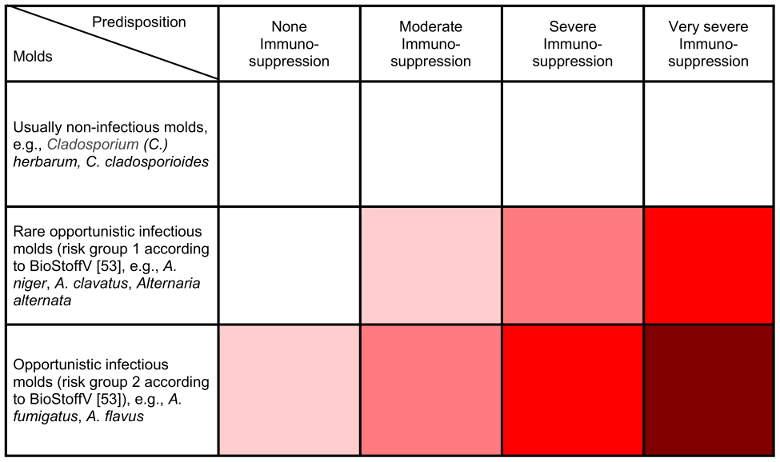 A prerequisite for a mold infection in humans is a pronounced weakness of the immune system (immunosuppression). This disease susceptibility (disposition) can only be assessed by a physician based on the three risk groups of the Commission for Hospital Hygiene and Infection Prevention (KRINKO) at the Robert Koch Institute [45].