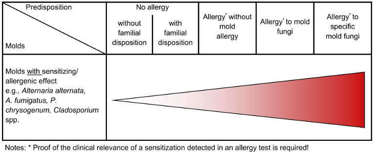 In principle, sensitization and triggering of a clinically symptomatic allergy in healthy people after inhalation of spores and other mold components (e.g., mycelium) is possible. Compared to other environmental allergens, such as allergens from fur-bearing pets, grass and tree pollen or house dust mites (approx. 15 to 30% [83], [84]), the sensitizing potential of molds is estimated to be significantly lower [85], [86], [87], [88]. Both population-based and patient-based studies show a comparatively low sensitization prevalence of 3–22.5% across Europe [89], [90], [91], which varies greatly depending on the type of mold and shows a north-south gradient (low sensitization prevalence in Finland, relatively high in Greece) [91].
