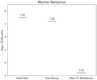 Figure 4: lg TCID50/mL titers of Murine Norovirus (MNV) on test surfaces before drying (initial titer), after drying, and following UV-C disinfection