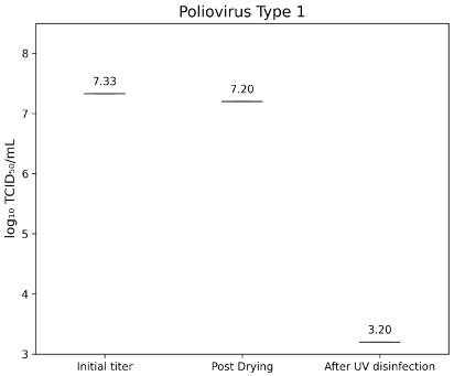 Figure 5: lg TCID50/mL titers of Poliovirus Type 1 on test surfaces at initial inoculation, post-drying, and after UV-C treatment