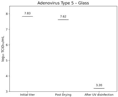Figure 7: lg TCID50/mL titers of Adenovirus Type 5 on glass test surface at initial inoculation, post-drying, and after UV-C treatment