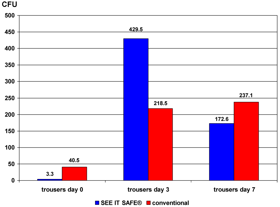 Overall, after concluding both parts of the study, it was shown that the number of CFU on the SEE IT SAFE® jackets, with the exception of day 0, was 3.8 times higher on day 3 and 2.3 times higher on the 7th day compared to conventional clothing (Figure 7 [Fig. 7]). Concerning SEE IT SAFE® trousers, the number of CFU at days 0 and 7 was lower than on conventional clothing. However, after 3 days, the number of CFU on SEE IT SAFE® trousers was nearly twice that on conventional clothing (Figure 8 [Fig. 8]).