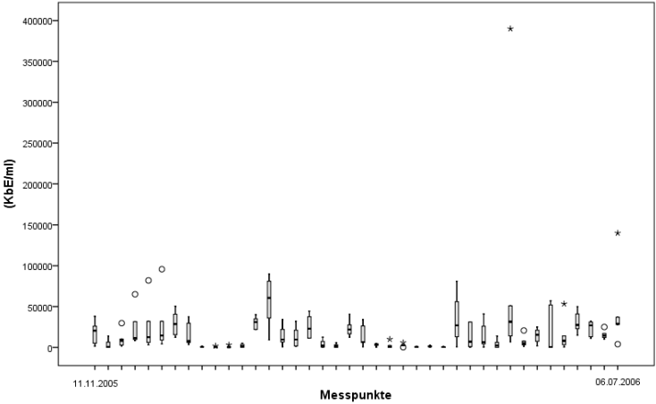 The mold charge differed a lot during the tests (Figure 2 [Fig. 2]). The threshold value of ≤100 cfu/ml [8] recommended by literature was exceeded for 64 out of the 156 measures. The highest individual values were documented prior to the application of ActiDes-Blue. Afterwards as well, values of >500 cfu/ml were reached at several treatment units. As to the mold charge, a wave-like sequence could be observed in analogy to the total colony count of bacteria [9]. The day of commissioning of the ActiDes-Blue procedure a medium value of 4.1 cfu/ml was measured. This increased to 94.2 cfu/ml within one week. After the water stagnation due to the Christmas holidays, the medium value had further increased to 560 cfu/ml, then decreased to <100 cfu/ml and only increased again to 206.3 cfu/ml following the first high chlorination. Following intercurrent variations, the medium values were only found to be below 100 cfu/ml after the second high chlorination.